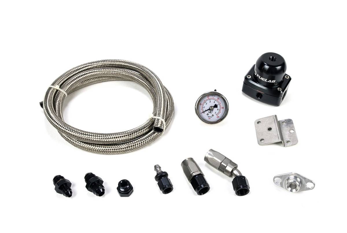 This kit includes a Fuelab adjustable fuel pressure regulator, black face fuel pressure gauge, fuel rail adapter, 4' of fuel line, and all necessary fittings to accurately adjust and monitor fuel pressure.