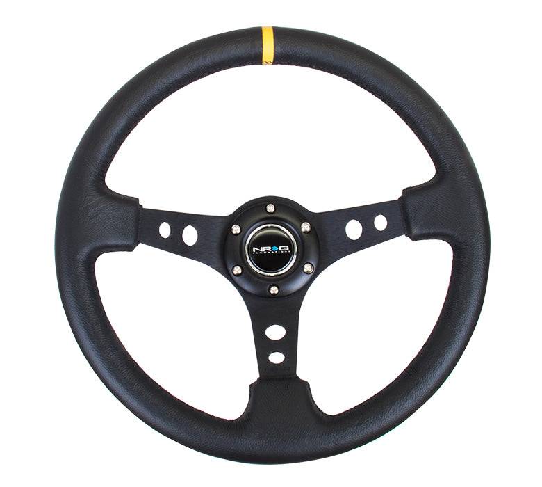 NRG Innovations 350mm Steering Wheel (3" Deep) - Black Spoke w/ Black Leather / Yellow Stripe