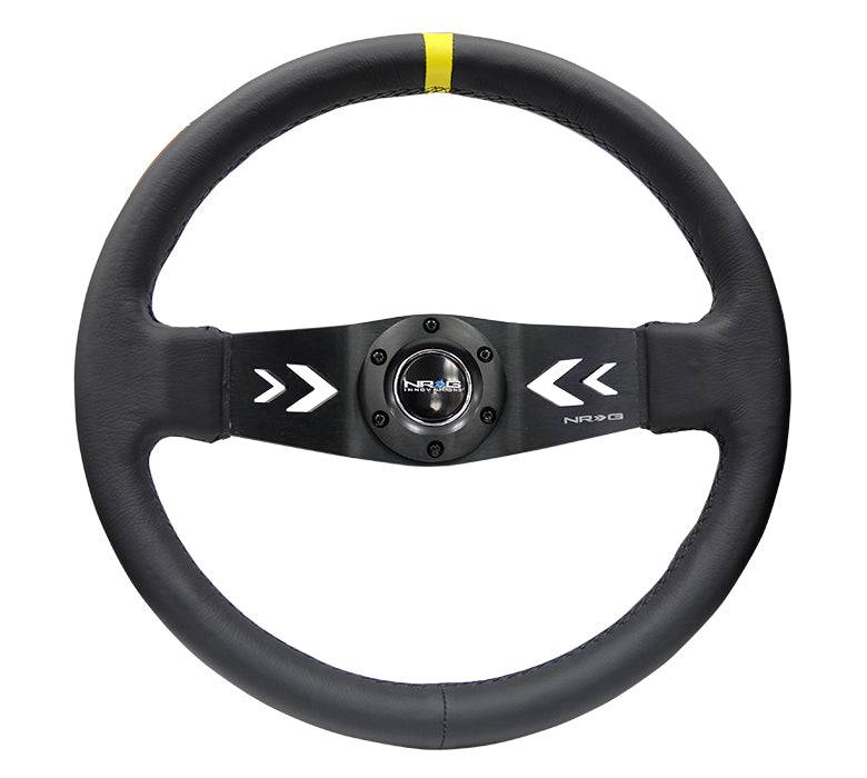 NRG Innovations Steering Wheel (350mm / 3in. Deep) Black Leather w/ NRG Arrow-Cut 2-Spoke & Sgl Yellow CM RST-022R-Y