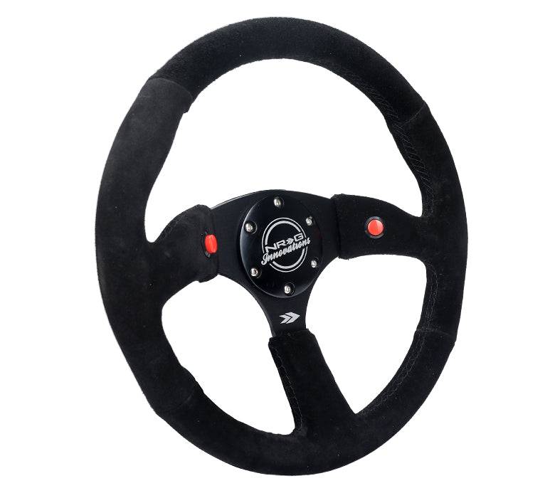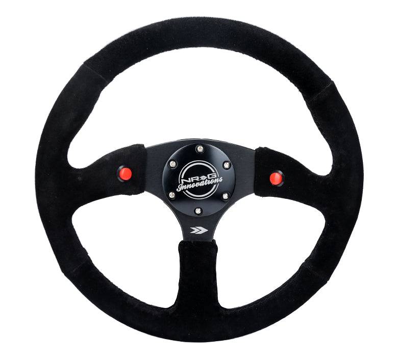 NRG Innovations 350mm Sport Suede Racing ( 2.5" Deep) Comfort Grip, 4mm matte black spoke with Suede finish and dual button RST-023D-S