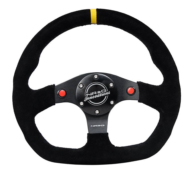 NRG Innovations Steering Wheel (320mm) Sport Suede Dual Push Buttons Flat Bottom w/ Yellow Center