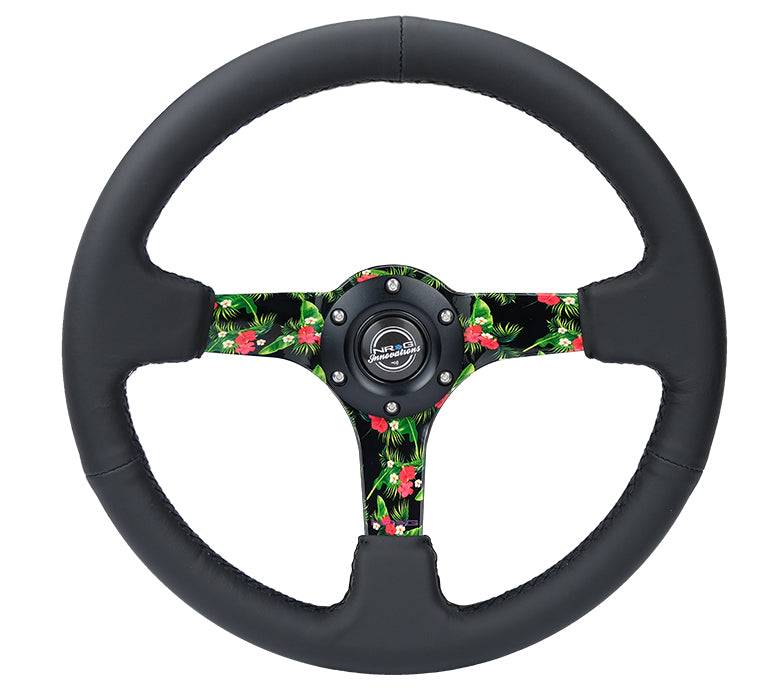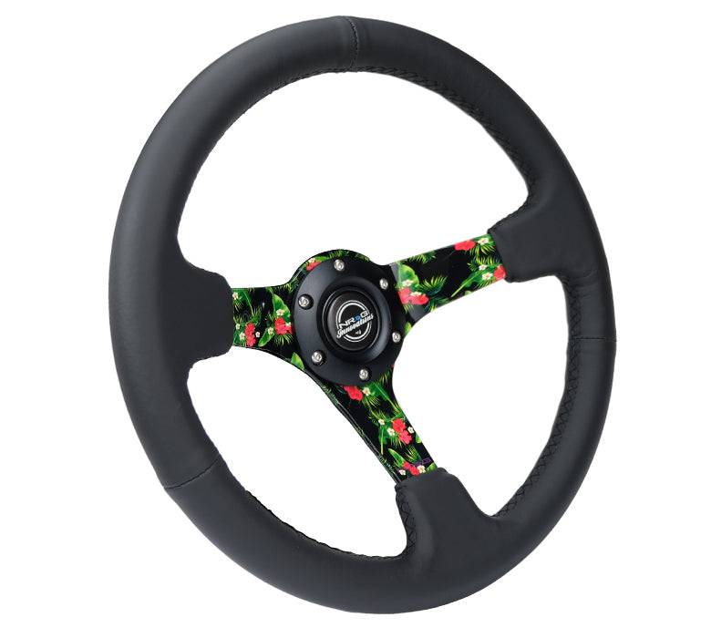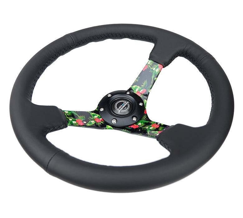 75mm deep, featuring a solid spoke design over the typical circular cut-outs for added material strength, covered in high density injection foam for the perfect grip and wrapped with varies material such as leather, suede, and alcantara.