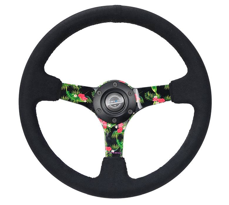 75mm deep, featuring a solid spoke design over the typical circular cut-outs for added material strength, covered in high density injection foam for the perfect grip and wrapped with varies material such as leather, suede, and alcantara.