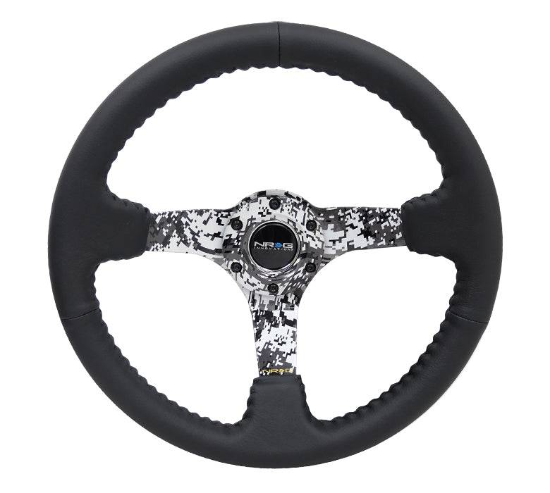 75mm deep, featuring a solid spoke design over the typical circular cut-outs for added material strength, covered in high density injection foam for the perfect grip and wrapped with varies material such as leather, suede, and alcantara.