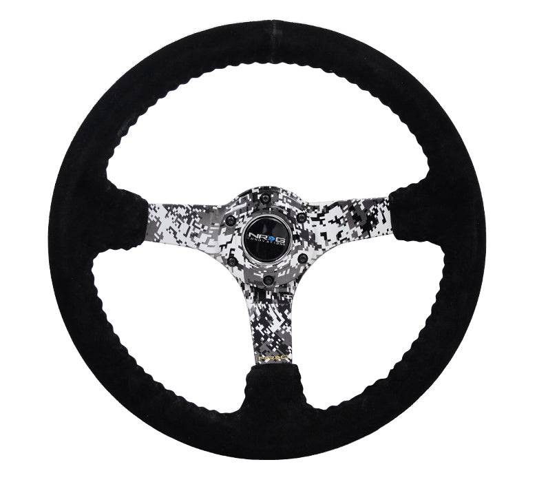 75mm deep, featuring a solid spoke design over the typical circular cut-outs for added material strength, covered in high density injection foam for the perfect grip and wrapped with varies material such as leather, suede, and alcantara.