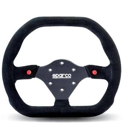 The Sparco P310 steering wheel is a 310mm diameter, 3 spoke flat steering wheel trimmed in black suede with an anatomical design and Sparco logo.