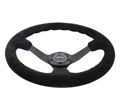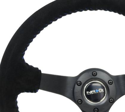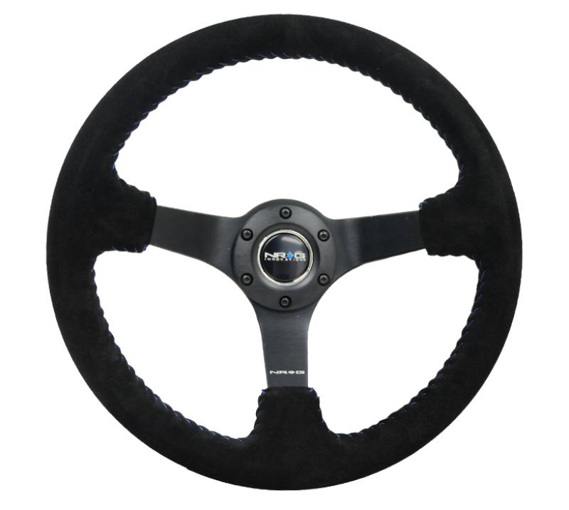 NRG Reinforced Steering Wheel (350mm / 3in. Deep) Black Suede/Blue BBall Stitch w/5mm Matte Black Spokes