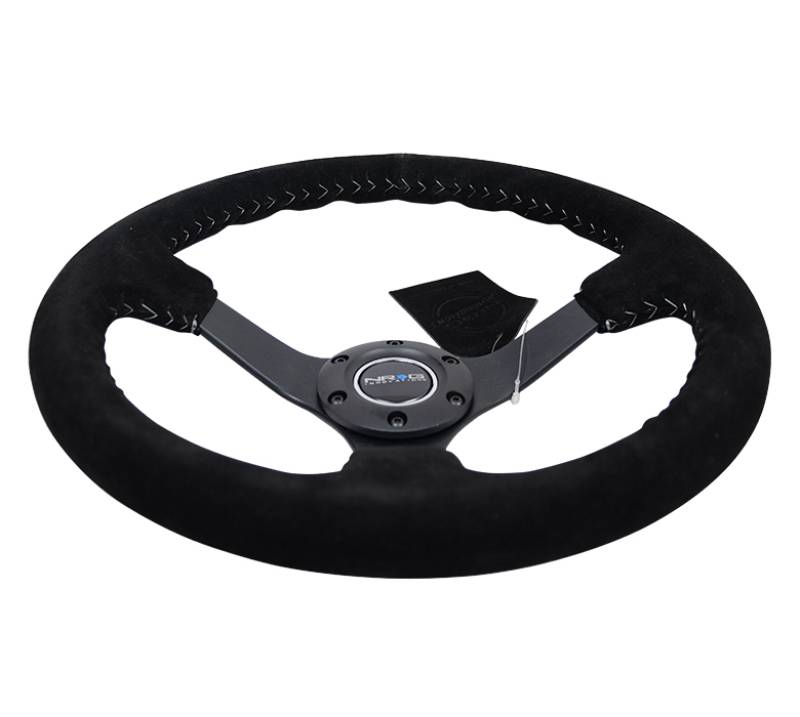 NRG Reinforced Steering Wheel (350mm / 3in. Deep) Black Suede/Silver BBall Stitch w/5mm Mt. Black Spokes