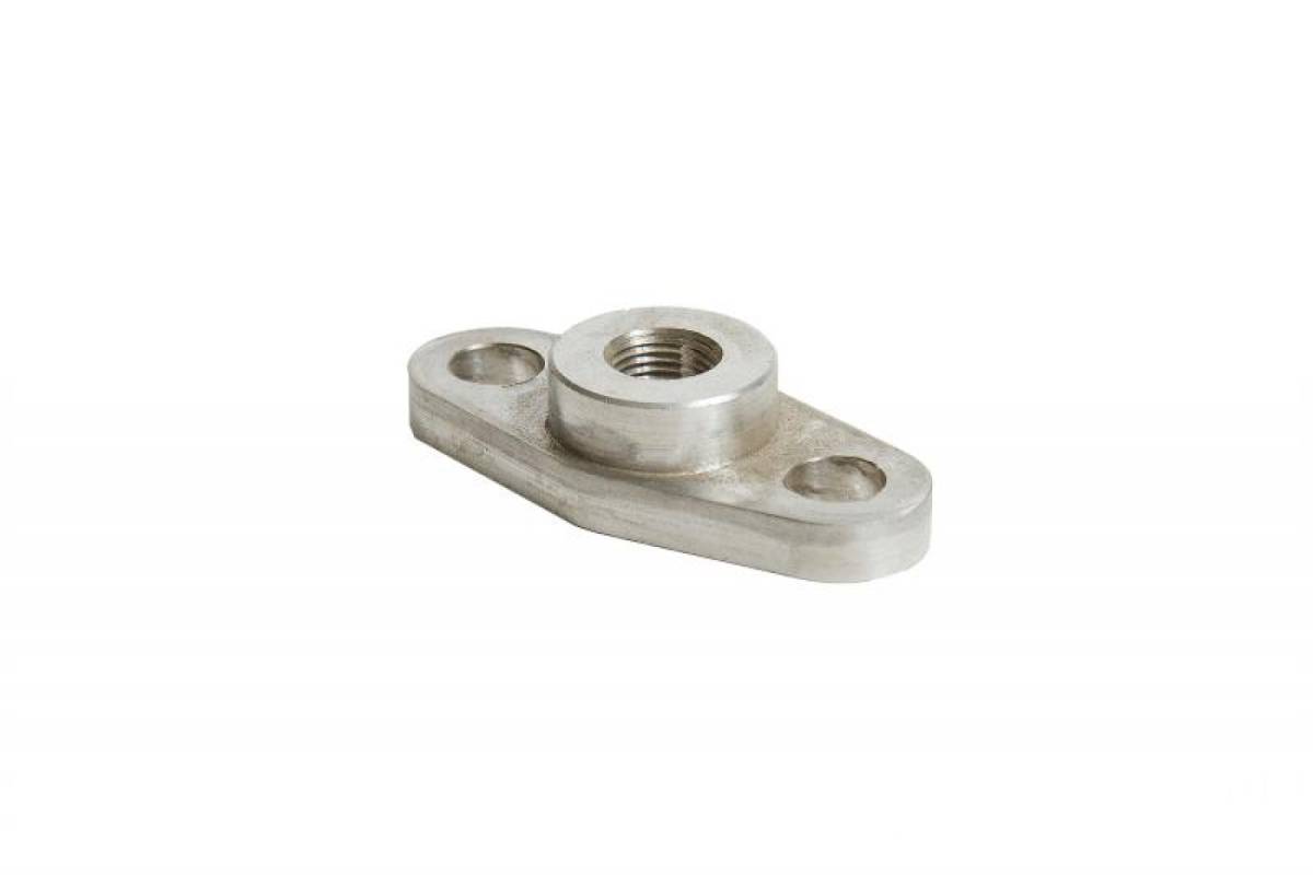 Full-Race billet oil feed flange for Garrett turbochargers. Certain turbos like GT40R do not have a tapped oil feed inlet so a feed flange must be used for installing the oil feed line. This flange can also be used with other standard Garrett turbochargers as well.