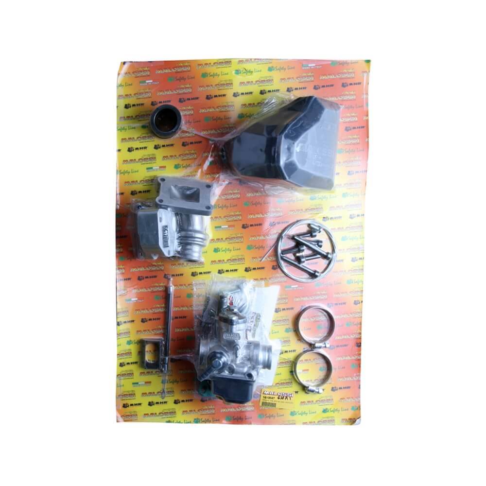 25mm Malossi carburetor kit with reed manifold for Vespa small frames. Includes PHB25 carburetor, manifold, air bellow, choke and throttle cables, and clamps.