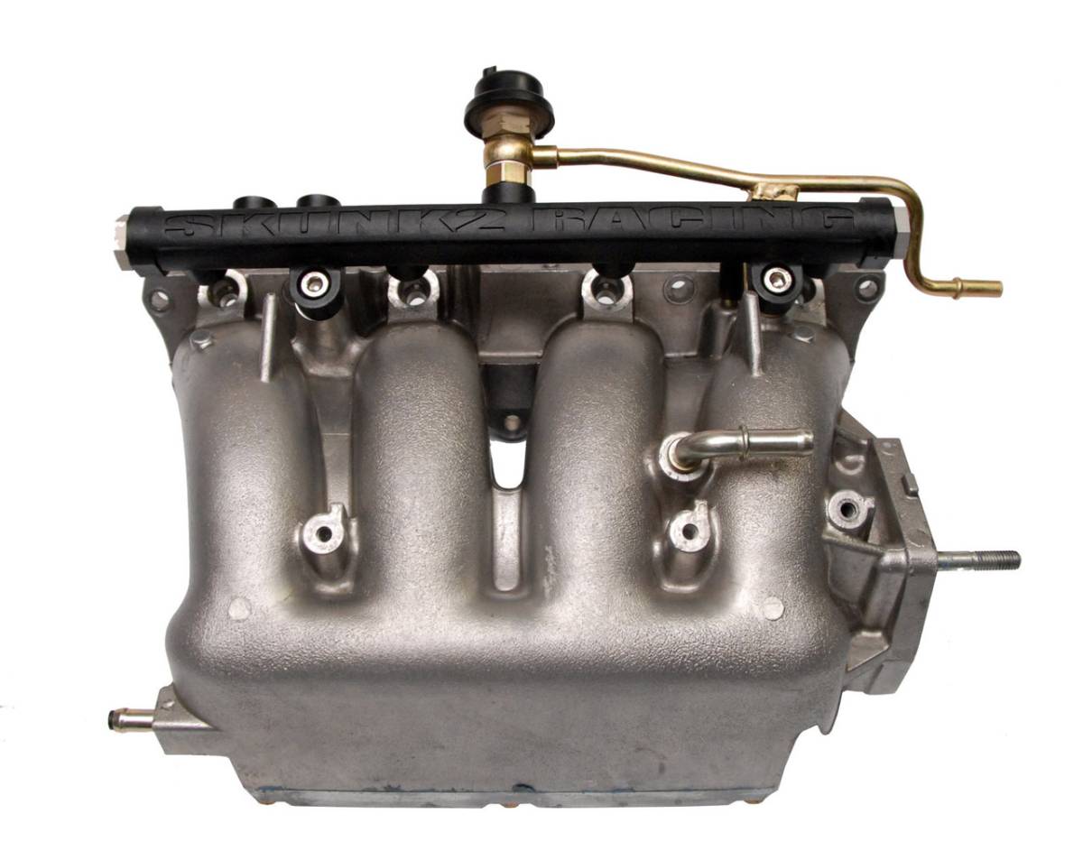 Skunk2’s new cutting-edge composite fuel rails are made using our proprietary carbon impregnated aerospace thermo-polymer composite. This material insulates the fuel from both radiant and conductive heat transfer under the hood. Keeping the fuel cooler results in an increase in horsepower and torque. We have seen power gains of up to 3% in real world testing. Skunk2 composite fuel rails feature a large 0.625” internal bore with radius inlets to the injectors thus improving flow characteristics. This type of radius injector inlet design is not possible with extruded and drilled aluminum fuel rails (which have sharp angles internally where the main bore meets the injector bores). Skunk2 fuel rails can be used with factory fuel lines and fuel regulators.