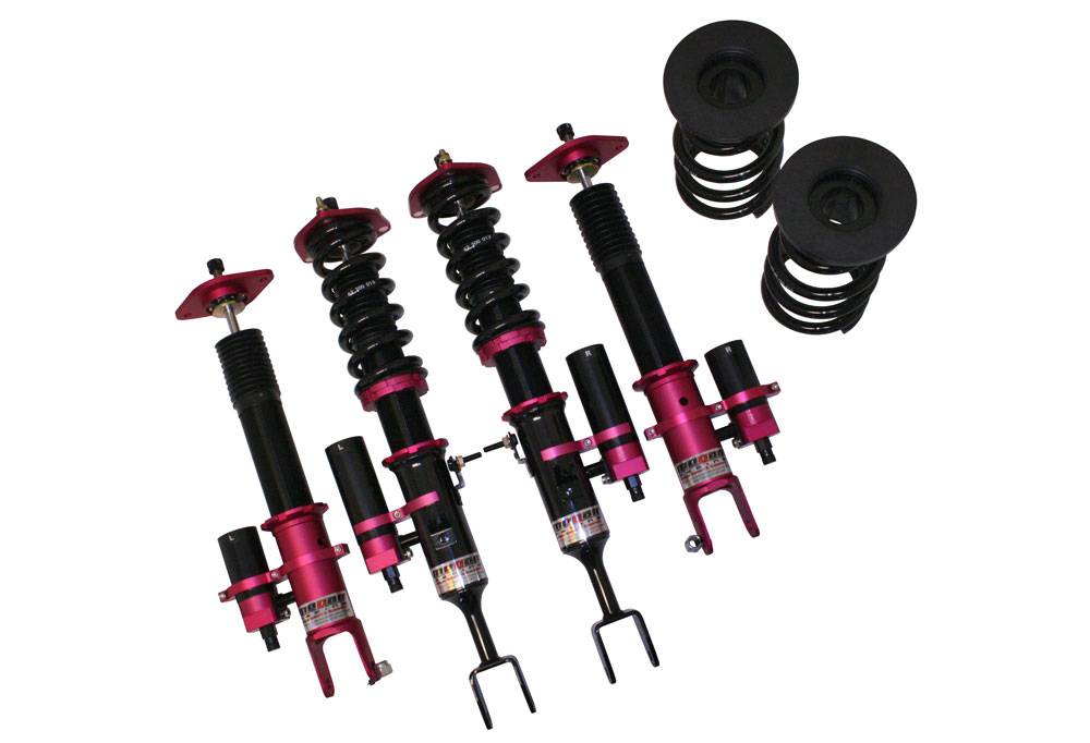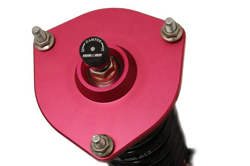Megan Racing Spec-RS coil over system features 32 levels of damper force adjustment, including separate adjustments for compression and rebound settings for increased tuning capability. The coil over body also features separate spring perch adjustment and full shock height adjustment independent of spring pre-load to retain full suspension stroke while allowing the vehicle to be corner-balanced, which is often an integral part of suspension tuning in an aggressive alignment. These damper kits utilize perfectly matched front and rear pillow ball upper mounts to reduce suspension deflection, and often include camber plates on applications which include strut-type suspension systems.