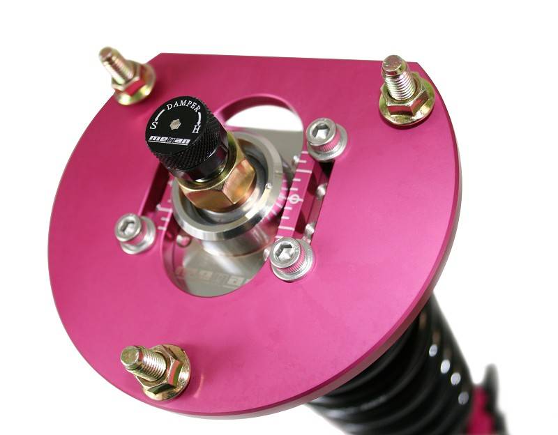 On applications utilizing strut-type suspension designs, the Megan Racing damper kits come with upper pillow-ball mount camber plates which are adjustable and allow you to easily tune your camber. This enables you to adjust your cars ride height and still adjust the camber to improve handling, vehicle predictability and tire wear, a nice feature for any situation, whether it is on the track or on the street. This improved level of adjustability will give you a competitive edge over other suspension setups.
