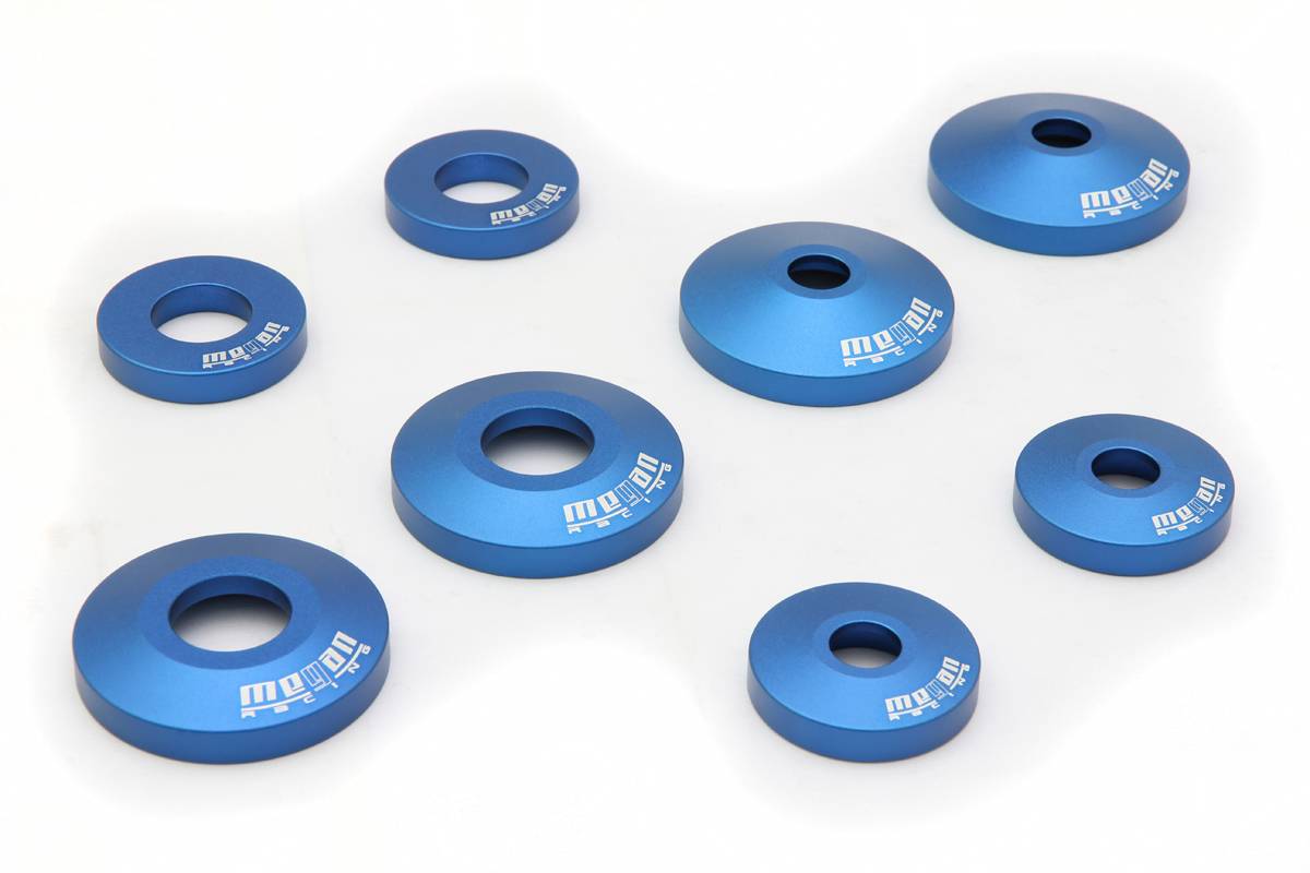 These rigid differential collar mounts replace the soft stock rubber mounts while utilizing a hardened rubber material which will withstand the forces placed upon them. The soft rubber bushings deteriorate from the constant vibration and flexing motion place on your vehicle during driving. This can cause the stock bushings to tear and may seriously damage your engine and transmission. These rigid differential mount collars were developed by Megan Racing to give your vehicle the added strength and durability for your car. These mounts are perfect for enthusiasts looking to push the performance of their car, as the mounts will help transfer energy into the wheels, instead of being absorbed by the stock soft rubber.