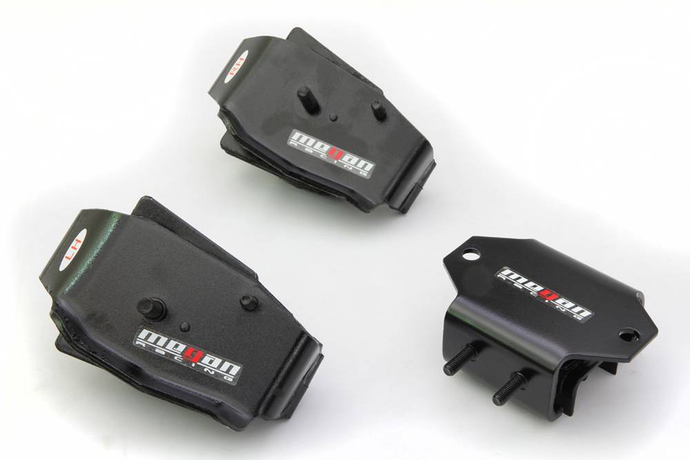 These engine mounts are made of a hardened rubber and polyurethane developed by Megan Racing to replace the stock soft rubber engine mounts. The OEM rubber mounts wear and deteriorate over time from the constant flexing and vibration your car experiences, as well as any harsh weather conditions. This can cause the stock rubber mounts to tear and may seriously damage your engine and transmission. Additionally, these hardened rubber replacement mounts enable more energy to be transferred into the wheels, rather than being absorbed by the stock soft rubber.
