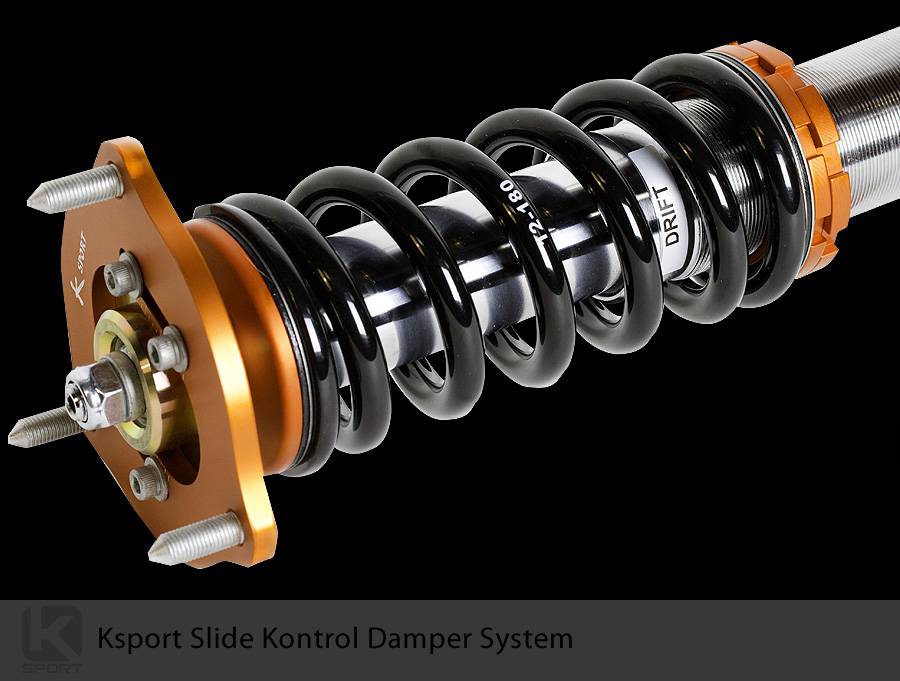 Ksport Slide Kontrol Drift Damper Systems provide the ultimate in suspension technology featuring 36 levels adjustable damping, inverted shock design on most applications, adjustable spring perch, adjustable body and Pillow-ball mounts. The Ksport Slide Kontrol Drift Damper System has been designed to endure the extended abuse and extreme handling-load of drifting.