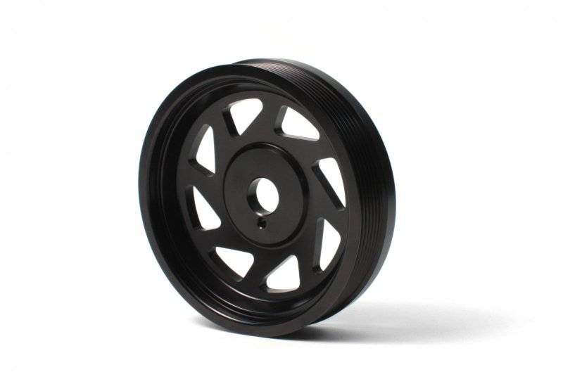 The PERRIN crank pulley is machined from 6061T6 billet aluminum, anodized black and laser etched for increased belt life and a precision fit.