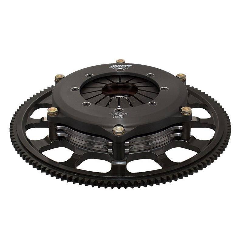 T1RR-H01 race, twin disc kits are race-ready for the serious enthusiast who needs a direct bolt-in kit, requiring no additional modifications. ACT's sintered iron race discs offer the highest torque capacity of all ACT race discs and have ultra-high heat capacity. Most kits offer pedal loads 10-20% higher than stock, yet increasing the clamp load by 80-90%. All ACT twin disc kits include a CNC-machined and dynamically balanced flywheel for trouble free use. All kits undergo an exclusive four-stage, heat-treating process on all diaphragms. ACT twin disc kits include a pressure plate, two discs, floater, flywheel and alignment tool. Some kits may include a pilot bearing and release bearing. ACT Twin disc kits meet SFI Specification 1.2.