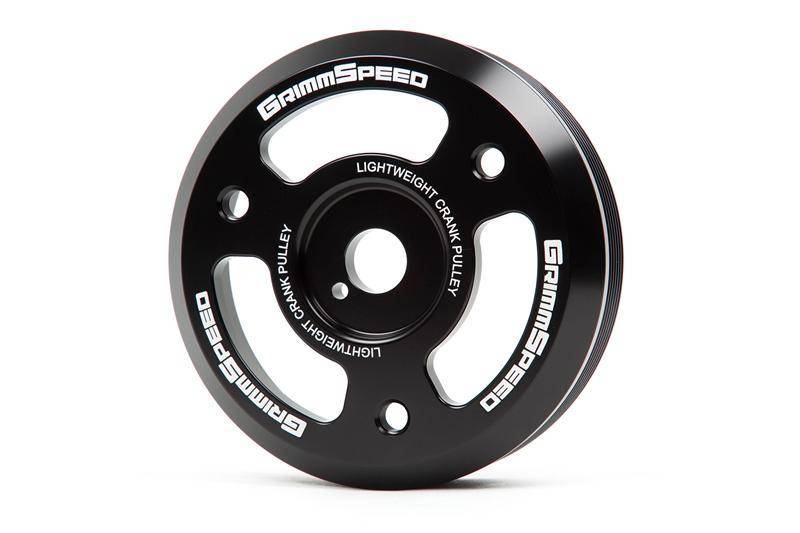 Your factory crank pulley is responsible for transferring energy from your crankshaft to your water pump, a/c compressor and alternator. It does this by way of a rubber belt and it does it's job well. The drawback to the factory pulley is that it's quite heavy. Reasons for this include less expensive manufacturing and using the pulley's mass to smooth out 'noise' in the accessory system (NOT to be confused with functioning as a harmonic dampener, which it does not). The GrimmSpeed Lightweight Crank Pulley reduces the rotational mass of the system, allowing your engine to accelerate and decelerate the rotating assembly more quickly.