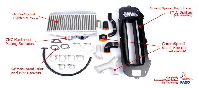 An intercooler functions by forcing the ambient air coming into your hoodscoop through the core, where it interfaces with the hot charge air and carries heat out the bottom. If your splitter doesn't seal perfectly, ambient air is likely to take the path of least resistance and slip around the TMIC. We've found noticeable performance improvement when using a correctly-fitting TMIC Splitter compared to an incorrectly fitting splitter. We has designed and manufactured a wide range of splitters so that no matter your application, you have a custom splitter that will extract maximum performance from the GrimmSpeed Top Mount Intercooler. Follow this link to learn more and be sure to use the correct splitter for your vehicle and hood scoop.