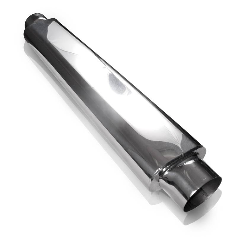 Smooth oval muffler, 304 stainless steel 2-1/2" ID inlet / outlet 2-1/2" x 4-1/8" body, 2-1/2" core with a overall length of 24" and a mill finish.