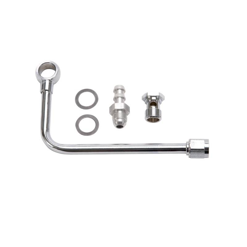 Fuel line; For Edelbrock carburetors; 3/8in. barb inlet; 1/8in. NPT fuel pressure gauge provision; Chrome